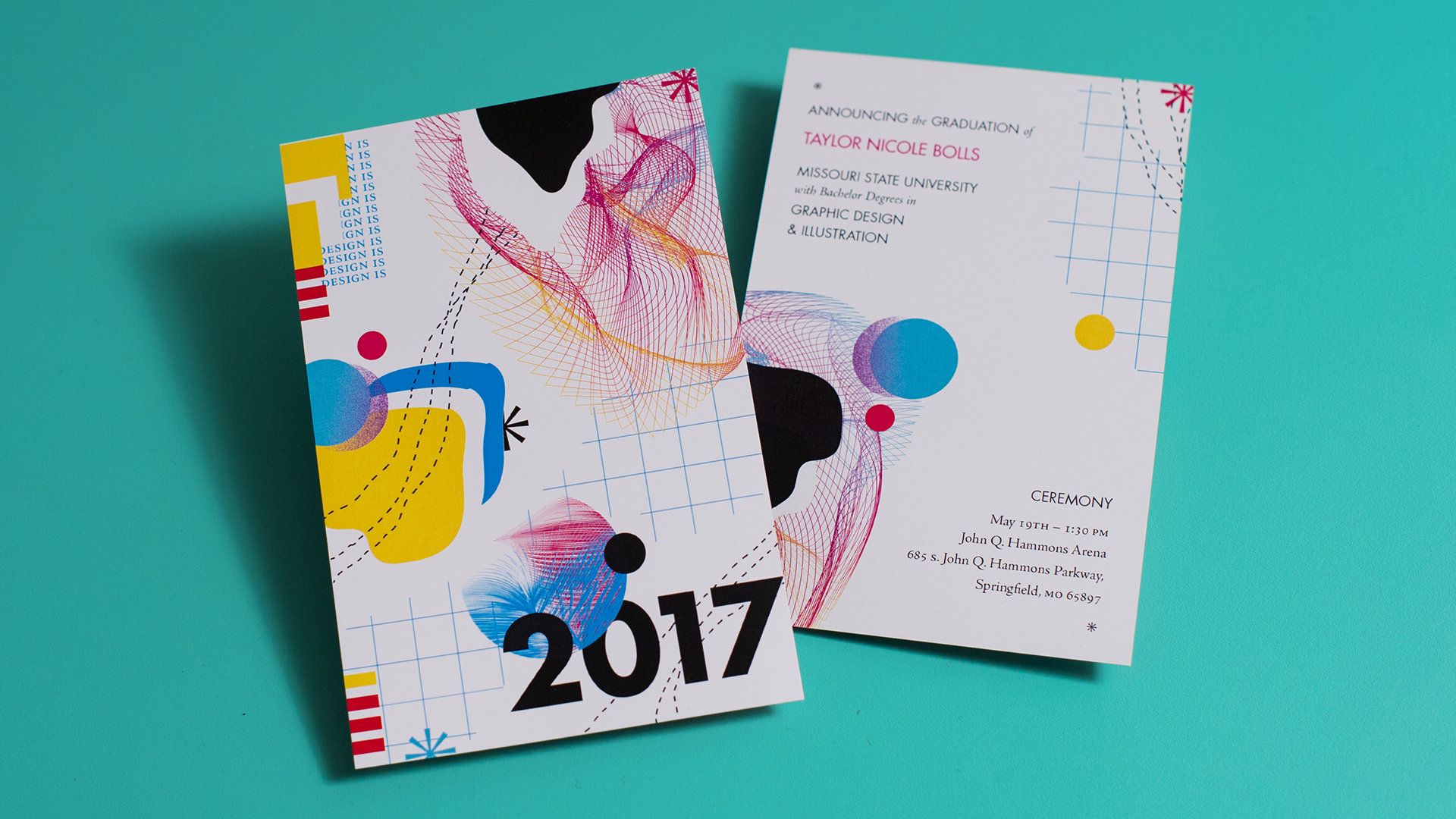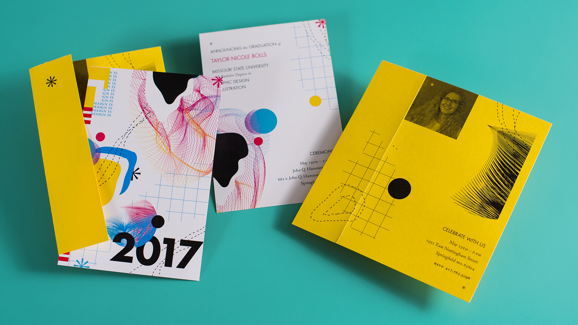These cards were created to announce my graduation from MSU in 2017 with degrees in Graphic Design and Illustration. I planned all parts of the card, and folded and trimmed then.